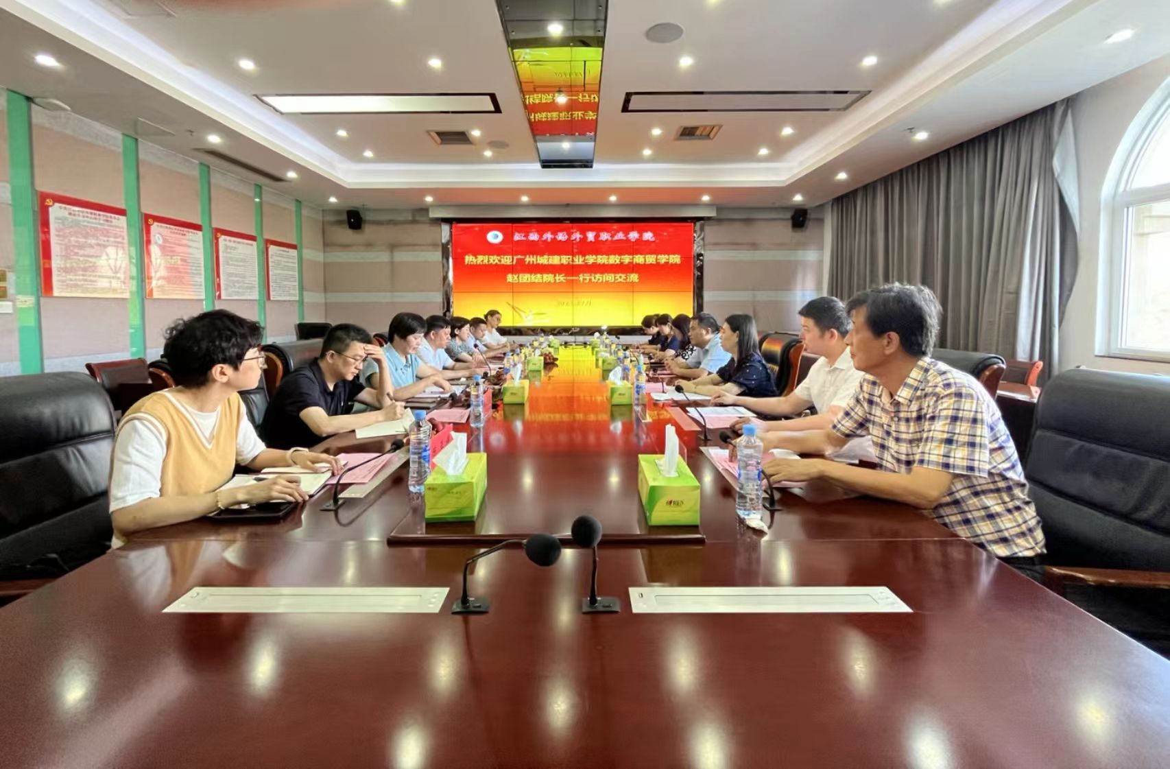 7月8日,数字商贸学院院长赵团结、副院长刘宁和袁其玲等一行7人,访问了江西外语外贸职业学院。江西外语外贸职业学院教务处处长张美忠、国际商务学院院长王燕萍、应用东语学院副院长刘春兰、英语学院副院长李步真、电子商务教研室主任吴韬、跨境电商教研室主任戴琴琴和会展教研室主任陈亚婷等参与了座谈交流会。会议由张美忠主持,双方就如何构建更适应市场需求的专业群课程体系、制定更具前瞻性的人才培养方案、技能大赛备赛以及开展有深度的教科研项目等议题展开了深入讨论。
