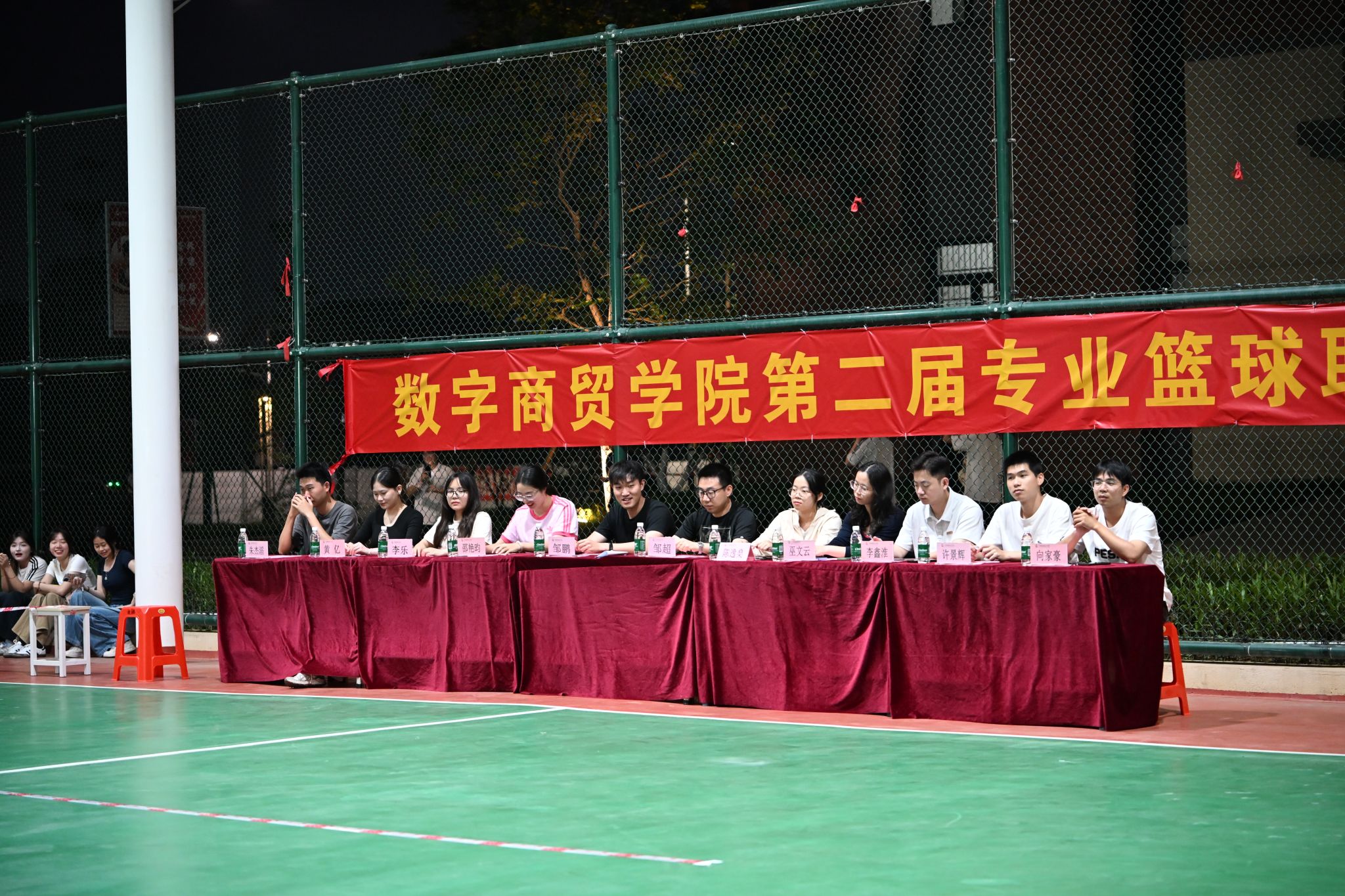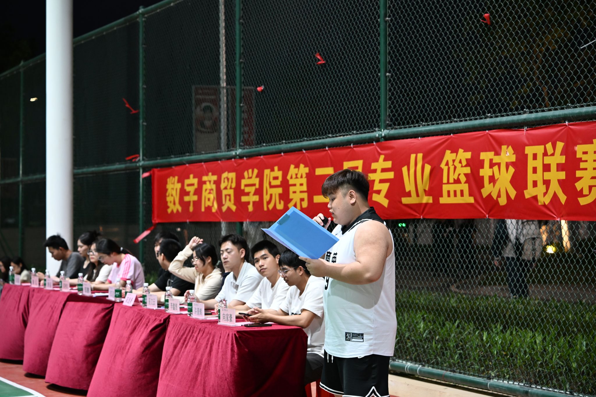 宣誓结束后,主持人宣布数字商贸学院第二届专业篮球赛正式开始,赛事就此拉开帷幕。现场参与人员有序观看,参赛队员迅速进入状态,准备迎接后续的角逐。