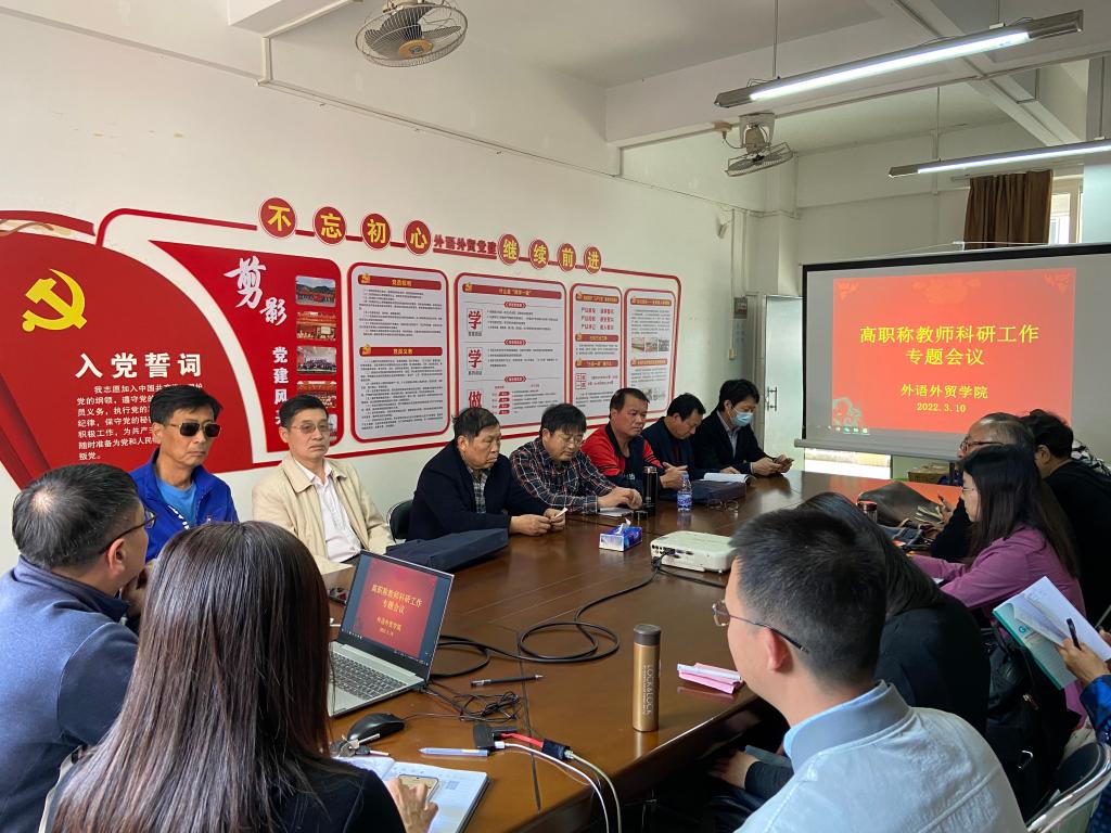 3月10日下午,为将2022年度科研工作落到实处,确保学院年度科研目标任务顺利完成,外语外贸学院组织高职称教师召开了科研工作专题会议。学院18名高职称教师参会,会议由学院科研副院长李霜主持。