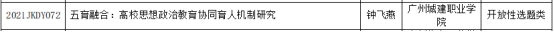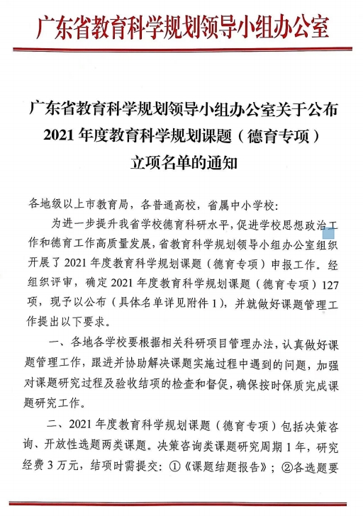 4月24日,在《广东省教育科学规划领导小组办公室关于公布2021年度教育科学规划课题(德育专项) 立项名单的通知》中,我院国贸与跨境教研室钟飞燕老师申报的课题《五育融合:高校思想政治教育协同育人机制研究》(2021JKDY072)获准立项。