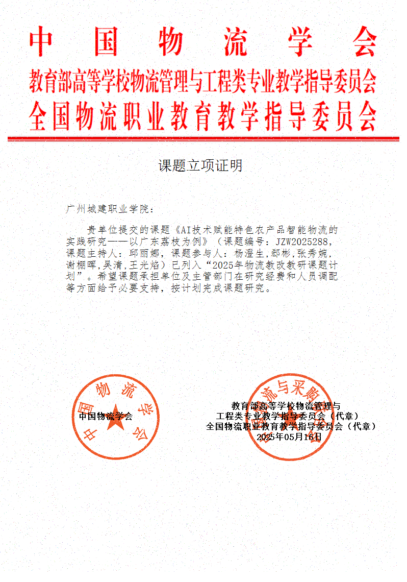 5月16日,我院邱丽娜老师申报的课题《AI技术赋能特色衣产品智能物流的实践研究——以广东荔枝为例》(课题编号:JZW025288)成功入选 “2025 年全国高校、职业院校物流教改教研课题计划”。