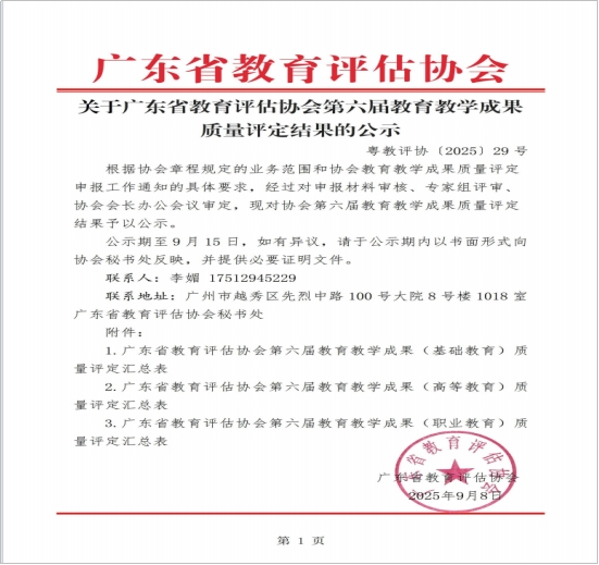 近日,广东省教育评估协会发布《关于广东省教育评估协会第六届教育教学成果质量评定结果的公示》(粤教评协〔2025〕29号)。由我院钟飞燕教授主持,联合桥集拉德外贸综合服务(广州)有限公司(广东省校外实践基地)及广东机电职业技术学院共同研发申报的项目《五育融合·三维赋能:商贸类专业课程思政育人模式探索与实践》,荣获第六届教育教学成果质量评定一等奖,这一成果彰显了我院在校企合作、校校协同推进教育教学改革方面取得的重大突破,标志着我院育人工作再上新台阶。