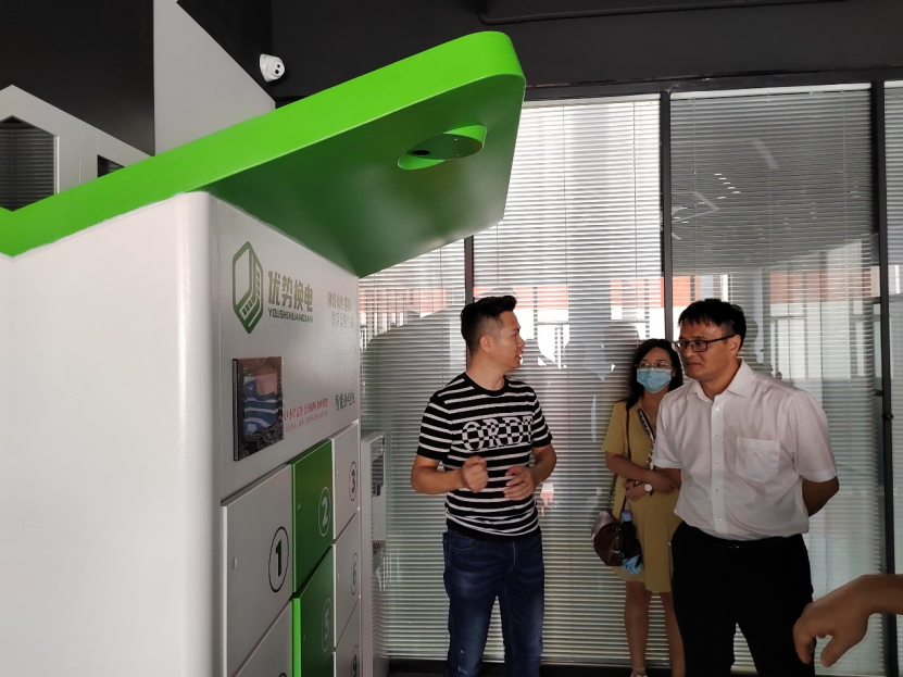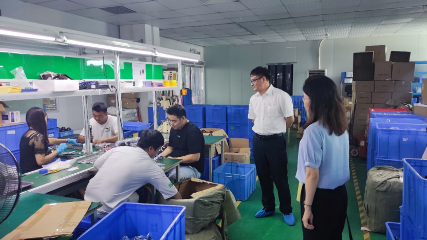 李志强一行在何忠明与张健的陪同下参观了深圳市赛金科技有限公司与深圳市优势换电新能源科技有限公司的生产车间与外贸业务部,详细了解公司主营产品的生产工艺、生产流程、品质检验、认证标准、目标市场、出口市场规模、用户画像与外贸业务发展等情况。