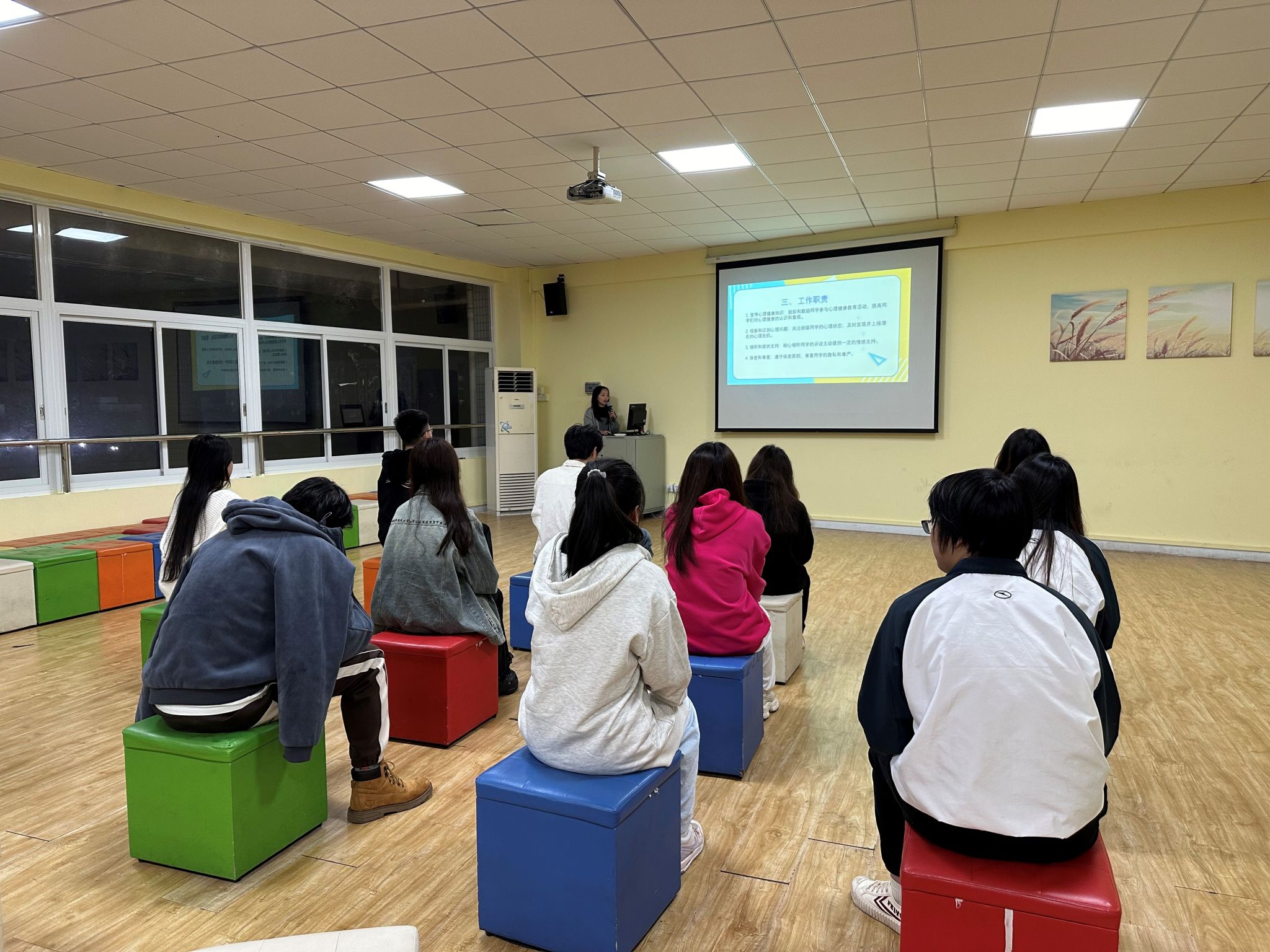 随后,陈泽敏老师进一步阐述了心理健康知识的重要性,并着重讲解了心理密友的角色定位与具体职责,明确了心理委员在班级心理健康体系中的关键作用及其工作职责。她不仅强调了心理委员作为倾听者、支持者和初步干预者的角色,还详细列出了心理委员在日常工作中应遵循的注意事项,如保密原则、积极倾听技巧以及适时转介机制等,以期让心理委员们充分认识到自身工作的重要性和价值所在,以及如何在班级中有效发挥积极作用。