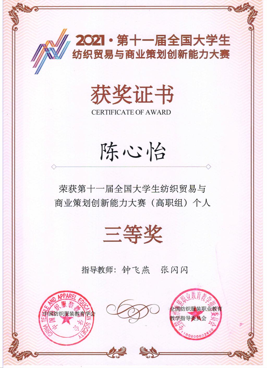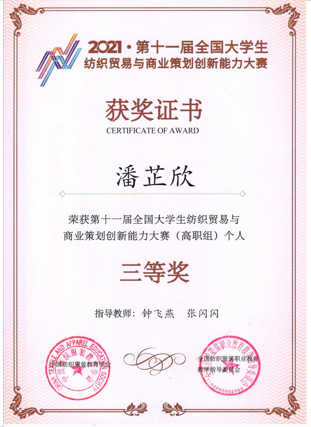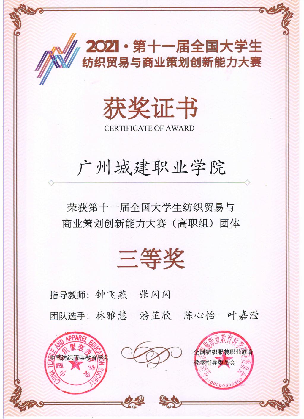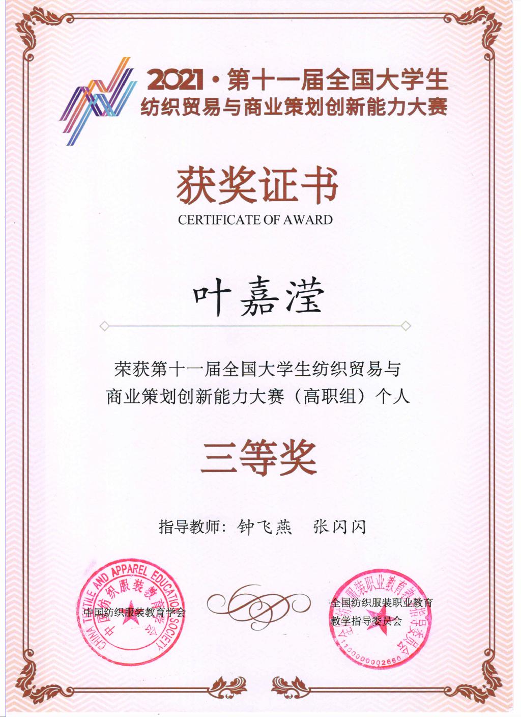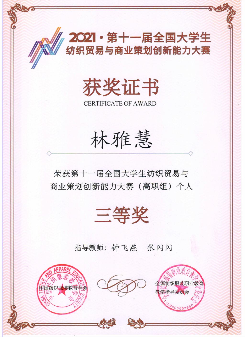 近日,由中国纺织服装教育学会、全国纺织服装职业教育教学指导委员会主办的第十一届全国大学生纺织贸易与商业策划创新能力大赛总决赛公布了比赛获奖名单。我院国际经济与贸易专业四名学生叶嘉滢、林雅慧、陈心怡、潘芷欣在钟飞燕和张闪闪老师的指导下,荣获个人三等奖4项,团体三等奖1项。